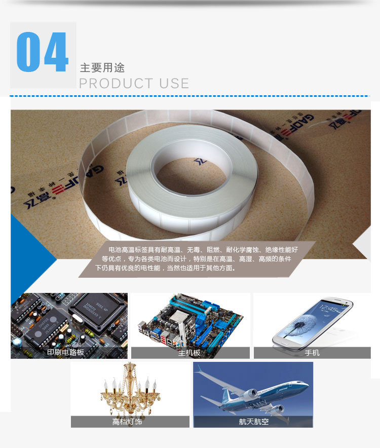 电池高温标签是以聚酰亚胺薄膜为基材,涂以特种压敏胶而成,具有较好的耐化学性和耐磨性,最高可耐高达320℃的温度,对助焊剂、熔融剂和清洁剂等化学物质具有一定抗腐蚀作用,使用于高温和磨损的极端恶劣的环境中能保持卓越性能。它是专为印刷电路板用字符或条形码标签而设计,因为它可以经受生产印刷电路板过程中所面临的焊接剂、熔融剂等的侵蚀。目前厚度主要是25um、50um两种。常用的颜色是黑色和白色 。耐高温标签贴纸广泛地应用于众多电子产品的SMT及波峰制程中、主机板、腐蚀产品、手机及锂电池等产品的耐高温标签 。
